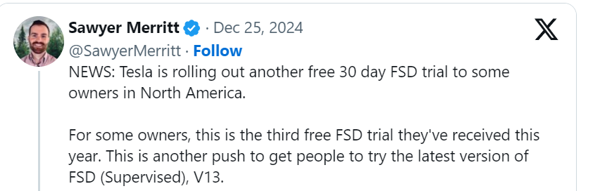 据外媒报道,特斯拉在北美地区向部分客户推出了新一轮为期30天的FSD全自动驾驶(需人为监督版)免费试用计划,在明年2月22日前,...