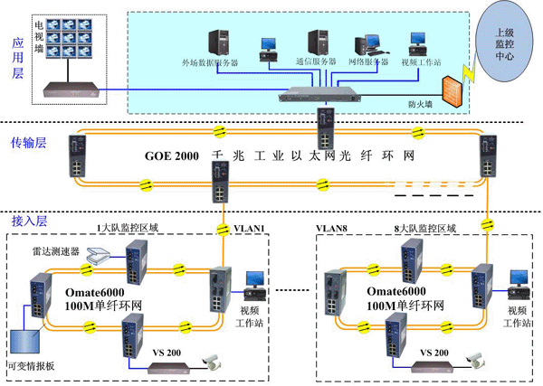 骨干传输网采用千兆工业以太网交换机构建,各个大队之间占用4芯光缆,组成千兆自愈环网。如在某处发生光纤、设备故障时,可在30ms之内完成网络重构,最大限度保证了业务的可靠性。同时高达1.25G的网络带宽及完善的网络策略,可以保证系统有充足的业务传输保障。
