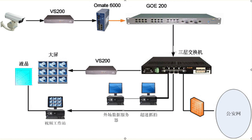 接入层是系统的最底层,负责图像,信息屏,测速点的信息采集。其中信息屏,测速点已经是数字接口,可以方便的接入网络。摄像机的视频信号是模拟数据,必须经过视频编码器进行数字化转换,才能接入网络。压缩算法采用MPEG2方式,可以达到广播级(DVD)还原效果。编解码总延时小于300ms。