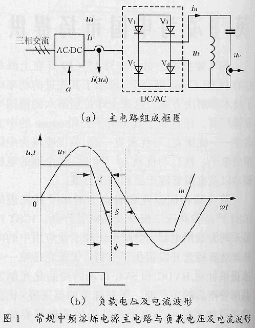 常规中频电源是由AC/DC可控整流器与单相DC/AC电流型并联谐振逆变器组成的,它在感应加热熔炼过程中的正常工作如图1所示,是以负载电路中的电流iH超前其电压uH为前提条件的。逆变电路中晶闸管的超前触发时间应大于晶闸管关断时间,即