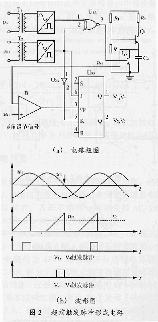 以德国AEG公司,英国RADYNE公司为代表的中频电源产品,都采用了TOT(turnofftime)定时控制法。其特点是按标准给定的TOT和实际TOT之间的差值及时对触发角进行调整,以便准确控制逆变晶闸管的关断恢复时间。前已述及,无论从安全运行要求,还是确保恒功率输出的要求,都希望调节触发角(即超前功率因数角φ)。为此,我们从参考文献[2>引用了“TOT”定时控制法的“超前触发脉冲形成电路”,以满足高效中频熔炼电源输出恒功率对φ角调节的要求。