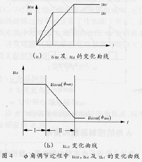 调节φ角的控制电路如图3所示。图中①是用于控制场效应管Q1“通-断”的比较器;②是φ角调节器;③是加法器;④是限幅电路;⑤是超前触发脉冲形成电路。图4给出了φ角调节过程中uHf(中频炉线圈电压反馈值),ud及uc1的变化曲线。系统在投入工作前uH*为最大值(可根据中频负载电路中电容器和逆变晶闸管的耐压确定),uc1的最大值uc1max和最小值uc1min对应于φmin和φmax。在阶段Ⅰ,直流电压ud还没有达到最大值,uH的大小完全由原有整流桥控制角α调节,此时ud小于比较器①整定值ub1,比较器①输出高电平,场效应管Q1导通,φ角调节器②不起作用,③输出为最大值,④输出为uc1的最大限幅值uc1max(φmin);在阶段Ⅱ,直流电压ud已达到最大值,比较器①翻转,使场效应管Q1截止,φ角调节器开始工作,并自动进行调节。若调节过程中φ角大于φmax。则由④输出进行限幅。