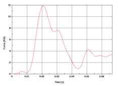 汽车正面全碰撞刚性障碍物是相对简单的一种情况,在实际使用中较常见且危险性更大的是正面偏置碰撞[2],即汽车在正面50%的宽度范围(如左侧)撞向障碍壁,为比较这两种情况的结构变形差异,本文对汽车正面偏置碰撞刚性障碍物进行了模拟仿真。这里只给出了前60ms的结果,图7和图8分别为整体和前舱部分的碰撞变形,图9吸能结构件碰撞力的变化曲线。