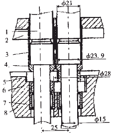 机床主要参数:C620车床允许最大进给抗力Ff=3600N,电机额定功率P=7kW。 可见总切削轴向力大于车床允许最大进给抗力,一般来说是不允许的。如果在机床尾部加一气缸作为辅助推力,一方面可作为进给动力,以减轻进给机构负荷,另一方面可作为平衡力,抵消因车床进给动力与切削轴向力不共线而产生的力矩,轴向力问题即可解决。 2 设计要点 1) 主轴箱体设计 图2、图3是所设计的主轴箱体与标准主轴箱体对比图,差异是一是增大了箱体刚性,二是将后盖连接方式改为底面连接,后盖结构改成与前盖结构相同。 图1中,3×f5孔与f12孔的中心距为25mm,该中心距要达到允许的最小极限值。受轴承外径的限制,主轴结构采用轴承错开安装式,以避免轴承发生干涉,如图4所示。根据表2选主轴轴径为f15,因所用轴承为无内圈滚针轴承,主轴直接与滚针接触,主轴材料选用机械性能较好的38CrMoAlA,表面镀铬处理,并用专门的防油罩和防油套防漏油。对于不受结构限制的主轴,可选用有内圈的滚针轴承,因主轴不与滚针接触,材料选用比较经济的40Cr或9CrSi,可用常规的防油套和毛毡防漏油。 主轴箱齿轮传动的排列方式有一层、二层和三层3种,本主轴箱为三层排列方式,采用直齿圆柱齿轮,齿轮模数选1.5,材料为40Cr。 表2 加工孔径与主轴直径对照表(mm)