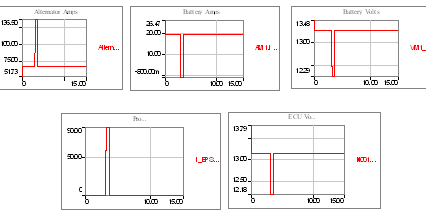 当EPS工作时,下图描绘了上述电路引起的PowerNet瞬态波动。注意:当电力分配网络稳定时,交流发电机提供给电池的最初充电电流。