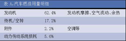 从明细表中可以看出,只有12.6%的能量用于汽车行驶。空气动力学和机械性能增强将会改善燃油经济性,而电子控制设备仍会带来改善空间。举例来说,如果采用集成式启动器,它在红绿灯口将发动机关闭,并在驾驶者踩油门时自动重启,就可降低空转时的17%损耗。
