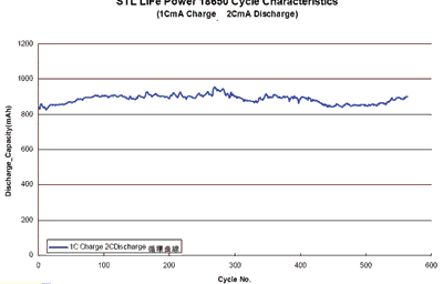 STL18650的充放电循环寿命曲线如图4所示。其充放电循环的条件是:以1C充电率充电,以2C放电率放电,历经570次充放电循环。从图3的特性曲线可看出,在经过570次充放电循环,其放电容量未变,说明该电池有很高的寿命。