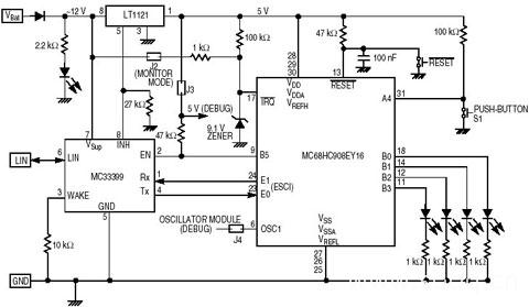 基本的LIN节点电路图比较简单,主要包括MCU,LIN物理层接口和1个5V的电压调节器。本电路中,物理层接口用MC33399,电压调节器用的是LT1121,可以被Freescale一颗新的系统基础芯片(SBC)所替换。MCU允许MC33399控制电压调节器。当LIN总线上没有任何活动时,MC33399控制电压调节器LT1121停止工作,从而使MCU掉电,使LIN从结点进入睡眠状态,整个从节点的静态电流将小于50微安。在从结点的电路板(除去QY4)上,我们可以看到所有的LED灯都关闭了(程序的最初设计,使得当MCU上电后,总是有1个LED灯是亮)。
