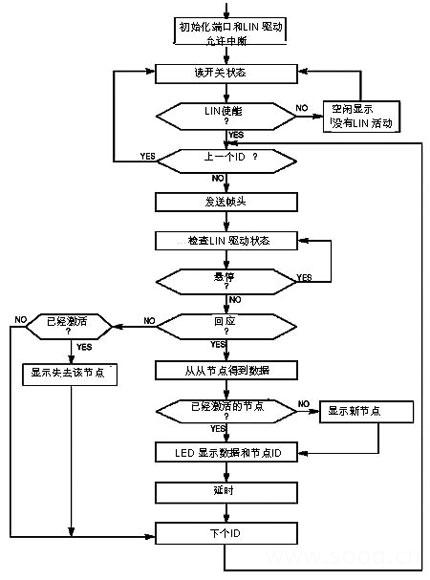主节点的软件流程图见图5。在单片机和LIN驱动程序初始化以后,通过主节点PCB板上的1个开关,调整LIN是否被允许工作。如果睡眠,主节点上的LED灯会关闭;如果LIN总线工作,则主函数Main将会周期的发送帧头到从节点。所有的ID号(如表1)在idList[16]中定义。如果函数LIN_MSG_STATUS()显示有对应于帧头的特定ID,从节点有反应,则反馈回来的数据被读取,同时,检查idActiveList[16]判断这是否为新的LIN从节点,如果是,则idActiveList[16]对应的位置1,然后NewNode()函数被执行,节点的LED灯显示有新的节点加入。