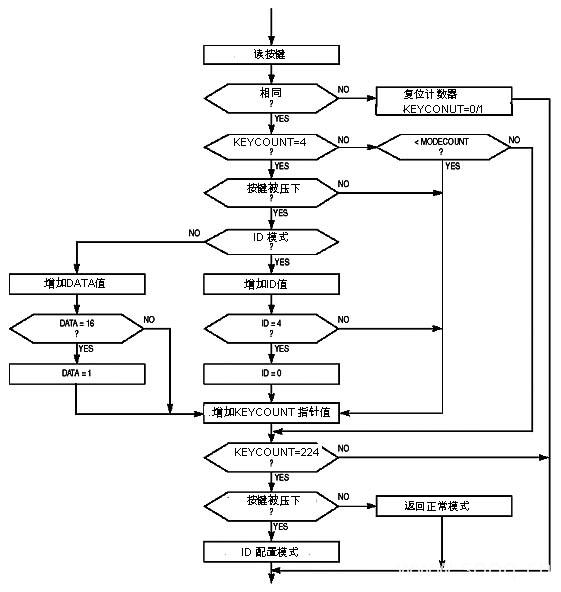 图7是按键软件流程图。首先判断按键有没有被按下,如果有则计算按键被按下的时间。如果按键按下的时间超过3秒,则进入节点ID配置模式(从0到4,然后再到0,反复进行);如果按键按下的时间为60毫秒,则数据(DATA)加1,然后用这个数据给LED显示,同时反馈给主节点(主节用LED显示此数据)。