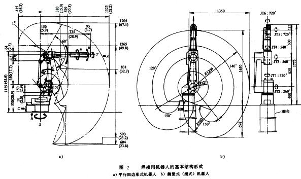 世界各国生产的焊接用机器人基本上都属关节式机器人,绝大部分有6个轴。其中,1、2、3轴可将末端工具送到不同的空间位置,而4、5、6轴解决工具姿态的不同要求。焊接机器人本体的机械结构主要有两种形式:一种为平行四边形结构,一种为侧置式(摆式)结构,如图2a、b所示。侧置式(摆式)结构的主要优点是上、下臂的活动范围大,使机器人的工作空间几乎能达一个球体。因此,这种机器人可倒挂在机架上工作,以节省占地面积,方便地面物件的流动。但是这种侧置式机器人,2、3轴为悬臂结构,降低机器人的刚度,一般适用于负载较小的机器人,用于电弧焊、切割或喷涂。平行四边形机器人其上臂是通过一根拉杆驱动的。拉杆与下臂组成一个平行四边形的两条边。故而得名。早期开发的平行四边形机器人工作空间比较小(局限于机器人的前部),难以倒挂工作。但80年代后期以来开发的新型平行四边形机器人,已能把工作空间扩大到机器人的顶部、背部及底部,又没有测置式机器人的刚度问题,从而得到普遍的重视。这种结构不仅适合于轻型也适合于重型机器人。近年来点焊用机器人(负载100~150kg)大多选用平行四边形结构形式的机器人。