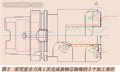 复合加工刀具一般是将几个加工内容组合在一把刀具上,从而只通过一次进给,便可完成全部的加工内容。这样就在很大程度上减少了加工时间,降低了生产节拍,提升了生产力。如在发动机曲轴芯轴端的加工中(图1),传统的工艺安排是车床粗车、半精车、倒角等,这一套工序完成需要耗时40s左右。而通过在CNC加工中心上采用了复合加工刀具后(图2),加工效率得到了极大地提高,加工时间减少了约70%,仅需12s。同时,不仅可以节省了一台车床,而且在不增加机床的情况下,将产量提高了3倍。