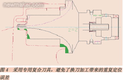 采用复合加工刀具不仅可以提高加工效率而且还可以提高加工质量。发动机零部件的加工要求十分苛刻,在加工过程中,不仅要保证相关尺寸的精度,同时还要保证相关尺寸要求之间的位置、轮廓等精度要求。为了达到这些尺寸要求如果采用几把刀具进行加工,那么在加工过程中很难保证各尺寸之间的位置精度,这就不得不停机花费大量的时间调整机床,但如果采用了复合加工刀具,就能轻松解决这些问题。