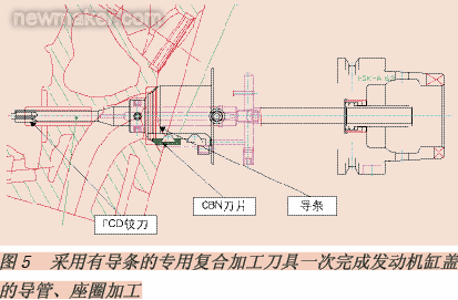 例如为适应高速加工的要求,复合加工刀具都必须经过严格的动平衡处理和验证。为了保证满足高精度、高精度保持性的要求,复合加工刀具对刀柄的选择、刀具本身的制造精度、刀具材料的选择等都有特殊的规范。如发动机缸盖的导管、座圈加工工序是汽车行业中难加工的典型。其特点是尺寸公差小,圆度、同心度要求高,加工表面的形状精度要求高。通过采用有导条的专用复合加工刀具(图5)加工,很好地满足了加工要求。该复合加工刀具具有如下特点: