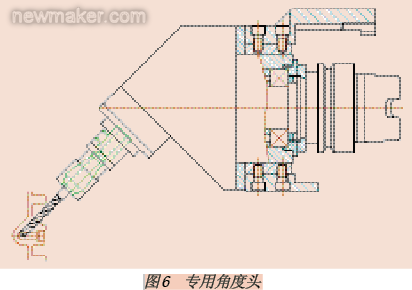 降低成本是企业一直追求的目标。在发动机生产中,低成本的要求从最初的生产线立项开始就贯穿于发动机的整个项目过程中,始终如一。而复合加工刀具的采用以及合理使用,可以有效减少设备投资,赢得最大的经济效益。例如零部件上有斜孔需要加工时,常规方法是在CNC加工中心上增加一个轴,使零件被加工面旋转到与主轴垂直的位置,以便加工,但成本约4万美元。相比之下,如采用复合刀具的方案:专用角度头(图6)+标准刀具+标准CNC加工中心,也完全能达到同样的工艺要求,而专用角度头的成本约3000美元。可见,成本下降是非常巨大的。