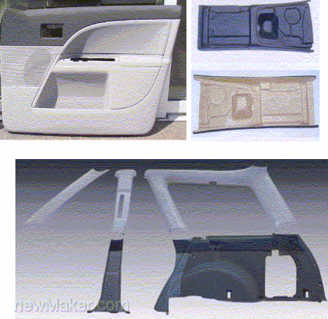 伟世通(Visteon)公司采用一步模压成形方法,使用的是德国R+S公司的成形设备,其第一个产品是福特公司“Mondeo”牌汽车的门板。中国“中华”牌轿车以其前卫的设计理念率先采用麻纤维天然材料制造门板、顶棚、衣帽架和行李厢衬板等内饰产品。德国戴姆勒-克莱斯勒(Daimler-Chrysler)公司研究中心进行的试验表明,天然纤维复合材料部件具有很高的抗冲击强度,并且它们的尺寸稳定性和耐侯性也很好。“奔驰”E级轿车门板开辟了高端应用的先河。