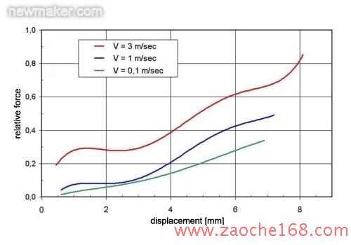 密封条变形的模拟是一个强耦合的FSI问题,橡胶材料经历了大应变和接触,空气填充腔在空气从小孔排出的过程中经历了非常显著的几何变形。这就要求使用强大的Arbitrary Lagrangian-Eulerian(ALE)网格更新功能。动画中显示了橡胶材料的应力分布,以及空气在密封条变形过程中的压力和速度变化。几何变形和流体的速度分布如图1所示。图2显示的是在三种不同的施加速度下,荷载的变化曲线。注意要施加速度对结果的影响很大。