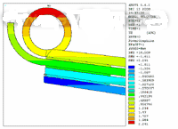 上面这些数据只是本算例的结果,不一定是一个最理想的设计,但是通过本文介绍的方法,说明了,应用CAE技术进行弹簧设计,完全跳出了传统设计方法中的人为假设和勉强的出自材料力学计算方法。计算几乎没有任何假定,他同时考虑到结构的大变形、接触状态和接触压力、组装时的预应力和工作应力的组合。这样我们就有可能在设计中调整各叶片形状尺寸,特别是初始弧高,取得理想的最优的精益设计。因为应用参数模型,我们可以方便地改变片长、自由弧高、片厚等数据,进行优化设计。