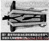 图3显示DPF(柴油机微粒捕集器)的示意图。蜂窝状的结构与DOC相似只是进口与相邻出口被交互堵塞以形成废气滤清。催化剂加在捕集器上或捕集器前的DOC上使微粒捕集器被动的再生这样通过催化转化器形成的N02不断对碳烟(Soot)进行氧化。如果在超过一半的时间内排放物温度持续高于250℃,则通常会发生这种现象。这种微粒捕集器通常要求燃油的硫含量低于30ppm。在柴油机燃油燃烧器或电加热器中,可选择一种用来将碳烟加热至氧化温度。大多数有补充加热器的系统不用催化剂,所以它们可用于含硫量更高的燃油。DPF系统还可用作消声器,用于每辆车的成本为2500~6000美元。由于微粒捕集器还能截留再生过程中所不能烧掉的无机灰(大部份来自机油),所以有时需将微粒捕集器从车辆中取出吹干净。根据润滑油的消耗和润滑油灰的组成,捕集器的再生时间从城市大客车的8万km到长途运输货车的40万km不等。