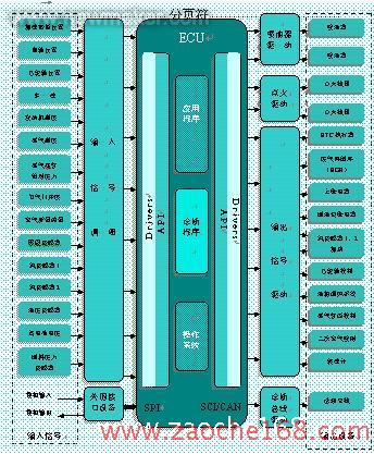- 电控单元ECU(Electronic Control Unit) 和控制算法程序软件 其作用是通过采集各种传感器输入信号并将信号进行调理,根据发动机管理控制算法进行运算,然后输出控制信号并进行功率放大给执行器。同时检测传感器信号正常状态,出现故障时报警。