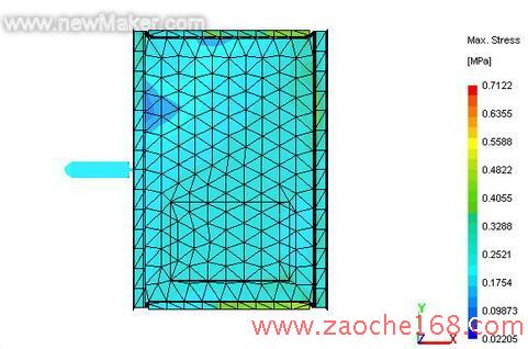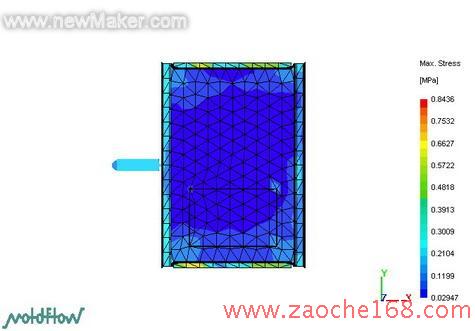 与上述按现生产工艺参数进行模拟的应力分布结果相比较,制品四边框和中间部分高应力值区域已消除,制品内部应力已大大降低,并且超值区分布较窄,从而使产品内在质量趋于稳定。