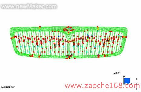 下面针对现有几种汽车塑料制件存在的质量问题,应用MOLDFLOW 软件进行模拟分析,探索将塑料CAE 技术与产品设计相结合,解决产品缺陷。以下是我们就塑料件的尺寸、缩痕、翘曲变形、应力集中等质量缺陷,应用CAE 技术进行模拟分析的几个实例: