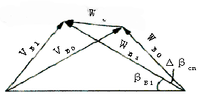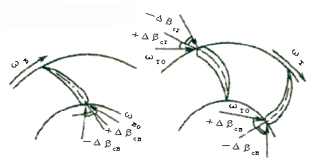 一般情况下,液流在叶轮进口处并不与叶片骨线进口方向一致。这样就会引起旋涡损失以及脱流区 使流道收缩而引起的附加摩擦损失。进口的相对速度ω 0与骨线间的夹角Δβc为冲角,见图2。 Δβc有正负之别。ω0流向叶片工作面时, Δβc正;ω0流向叶片背面时, Δβc负。叶片工作面压力高、背面的压力低。