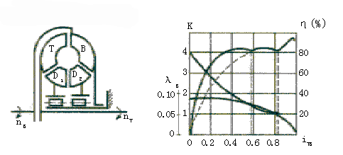 变矩器使用过程中,如果工况变化较大,而对设计工况 转速比没什么特殊要求,由于变矩器最高效率只有85%~92%, 当启动变矩系数K0要求较大,则最高效率对应的转速比一般 小于0.6,而当iTB>(iTB)K=1 后,其效率会很快下降。为了在高转速比工况下有较高的效率,我们可以采 用综合式液力变矩器或闭锁式液力变矩器。