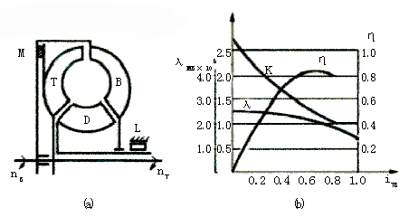 涡轮通过闭锁离合器M与泵轮相连,从特性曲线(如图6)可知,闭锁式液力变矩器在 iTB>(iTB)K=1时,比综合式液力变矩器效率高,但由于有鼓风损失, 虽然泵轮与涡轮刚性连接,其效率也不可能达到100%。而且当泵轮与涡轮不对称布置时,循环圆中会有流体流动,这也要消耗一些能量。