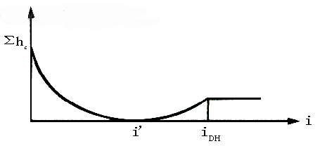 可见,液力变矩器总的冲击损失在i≤iDH时, 是以纵坐标i=i’为对称的抛物线,在i>iDH时,近 似为常量,如图7所示。当i=i’时,Σhc=0,说明 在泵轮的转速与涡轮转速接近时,无冲击损失;当i=0时,冲击损失最大,这与工程机械的工作情况 相符。