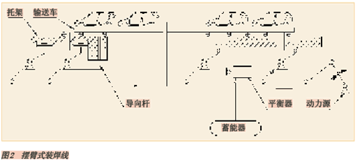目前使用的焊装线主要是由输送部分、工装夹具、焊接设备及其他辅助设备等部分组成,主要结构形式有:交叉臂步进式、摆臂步进式、滑橇输送式和台车式等。