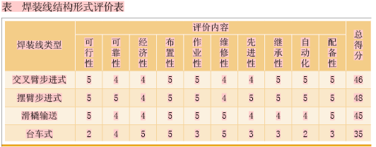 从表中可以看出,摆臂步进式焊装线得分最高,但选择何种形式的焊装线须根据具体的设计条件、产品质量要求、产品结构和工艺来确定。