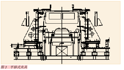 1、平移式夹具(如图3所示),其动作顺序为:输送线将预装白车身送入总焊工位定位夹紧点定,输送线抬起,将点定成形的车身水平送入后续的工序补焊。此类夹具定位精度和可靠性高,可适用于单排、双排、卧铺车的宽窄、高低系列的大批量混流生产、柔性度高。