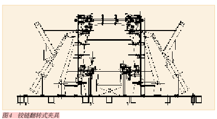2、铰链翻转式夹具(如图4所示),此类夹具和平移式夹具的工作原理类似,唯一的区别是左右侧围总成的定位组件的打开方式不同:平移式夹具沿垂直于线体输送方向水平移动,而铰链翻转式夹具则是绕铰链轴旋转打开,这样便于线体输送、装配及定位夹紧。