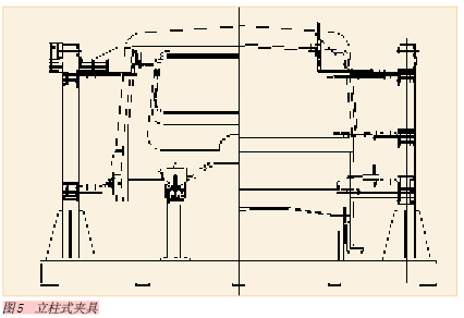 3、立柱式夹具(如图5所示),此类夹具结构简单、成本低、维修方便、操作时接近性好,但其定位精度较低,不适用于自动化程度较高的大批量生产和采用焊接机器人的生产线。