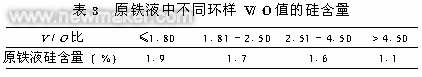 硅是强烈的石墨化元素,由孕育剂进入铁液中的硅比铁液中原有硅的石墨化能力更强。由于活塞环在铸型中的冷却速度非常快,只有达到GOETZE技术条件规定的石墨球数(>30000球粒/cm2)才有可能达到铸态基体组织中渗碳体<5%。所以孕育是至关重要的,应选择如上所述的有强烈孕育作用的孕育剂,但用量不宜超过0 6%,以免出现开花状石墨。为具有足够的石墨化能力,视环样V/O比值,总硅量宜在2 4%~2 8%,扣除孕育剂、球化剂中带入的硅,控制原铁液中的硅含量见表3。