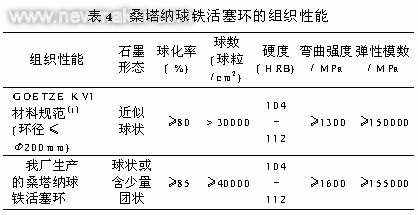 目前,本厂已较成功地应用中频炉及电弧炉生产出桑塔纳轿车、“XF157”、“6105”等多种主机的单体双片球墨铸铁活塞环,其金相组织(球化合格率、石墨球数合格率及球径大小)均达到了国外同等要求,铸件废品率也极低,最终的球墨铸铁活塞环产品有较好的力学性能(见表4),满足了用户的需要(自1995年本厂给上海大众配套供货至今,共生产桑塔纳球铁活塞环千万余片,质量优良,供货稳定)。