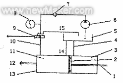 电控辅助制动器的制动主泵如图 2 所示。图 2 中,1 为推杆;2 为活塞;3 为补油室;4 为补油路;5 为储油室;6 为油泵;7 为单向阀;8 为储压器;9 为控制阀;10 为进油路;11 为压力室;12 为通往各制动的分泵;13 为制动主缸;14 为进油路;15 为回油路。