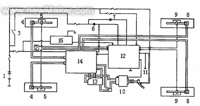 原来的汽车制动主缸13(见图 2)上有一个进油孔[2](接油路 14)和一个补油孔(接油路 4),推杆及活塞是由驾驶员的脚来控制的,有一个驾驶员的反应时间间隔,使汽车制动存在着延时的问题。现在,在储油室上另加一套装置,包括油泵 6,单向阀 7,储压器 8,控制阀 9。把油路接入压力室 11,控制阀 9 由防抱死制动系统执行器 14(见图 3)控制。当路况传感器 2 将路况信息传入防抱死制动系统计算机 12 后,由计算机判断是否需实施紧急制动。若需要便接通控制阀 9(图 2),使油进入压力室,并流入各制动支管,增大 4 个轮上液压制动分泵(见图 3 中的 4 和 8) 上的压力,促使车轮紧急制动,使汽车停在一个安全的位置。控制阀 9 的开度可以随控制电流的大小而改变,可以控制进入油管的油量,进而控制压力室 11 的油压,随着输入控制阀电流的增加,压力室的油压将随之增加。图 3 中,1 为电池组;2 为路况传感器;3 为点火开关;4 为盘式制动分泵;5 为前轮速度传感器;6 为防抱死警告灯;7 为制动器指示灯;8 为盘式制动分泵;9 为后轮速度传感器;10 为制动器主泵;11 为通往制动信号灯;12 为防抱死制动系统计算机;13 为 P 阀;14 为防抱死制动系统执行器;15 为继电器。