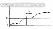 图 5 表示了当路况传感器测出汽车前方有深沟时的输出曲线。图 5 中,Δt=2t2-2t1。当 2t2 无限长,或者说深沟很深或很宽时,Δt 就无限大。从图 5 中可以看出,其输出信号通常包括因路面不平或车身振动等因素所引起的干扰信号,如果完全按照这样的输出信号进行控制时,汽车将无法正常行驶。因此,在控制系统中设定了一个阈值 U1,当路况预测信号高于 U1 数值时,控制单元输出信号接通制动主泵上的励磁线圈,同时根据车速传感器[3]检测出的车速,可以估算出制动距离 S。当 S