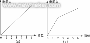系统通过拨动编程开关来调用存放在E2PROM中的各种制动力参数,以适应不同车辆和路况需求。编程开关共有8个,678用于设置各个档位制动力的大小,678分别为ON/ON/ON时,制动力为100%ON/ON/OFF95%ON/OFF/ON90%ON/OFF/OFF85%OFF/ON/ON;:80%OFF/ON/OFF75%OFF/OFF/ON70%OFF/OFF/OFF65%;编程开关5用于设置各个挡位之间制动力的变化情况,为ON时,各个挡位制动力均匀增加,为OFF时,12挡增加的快,3456挡增加的慢,如图3所示。编程开关4用于设置控制器的软特性,为ON时,控制器的制动力逐渐增加,六挡时的延迟时间约为0.4s,为OFF时,控制器取消软特性。开关123作为保留功能使用。