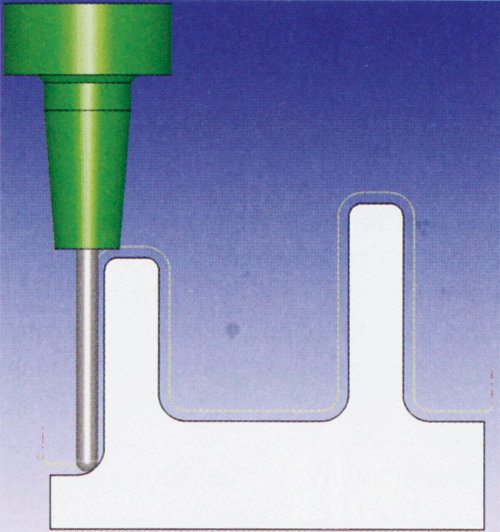 只要工件型腔不是很深(相对刀具直径而言),三轴刀具路径(2、3、5)就足够了。如果工件型腔很深并有很窄的部位,使用纯粹的三轴刀具路径来完成整个精加工是不够的。在这种情况下,差的表面质量和较长的加工时间随之而来。图1是三轴刀具路径的情况,这里,最短的刀具都长度必须很长,以期在垂直的方向能够加工到工件的所有区域。