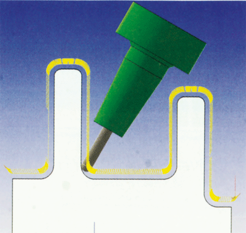 一个可以提供柔性的最新的途径是,模具制造、冲压工艺、刀具应用三个方面都使用能自动生成刀具路径的CAM软件模块。简单说来,这个模块能自动地把三轴切削路径转化为五轴加工的路径,使旋转刀具的倾斜角足以避免振动,这样也带来了更大的柔性,因为所有的三轴精加工路径都可以转化为五轴环境使用。