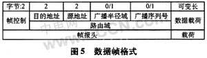 接收模块和采样模块采用主从方式,接收模块可看做是主设备,轮胎内部的采样模块是从设备。为实现采样发射模块与接收模块之间可靠的无线通信,两者之间必须以一定的协议进行。 ZigBee网络中包括协调器、FFD(全功能器件)和RFD(简化功能器件),并支持星形网络、树状网络和网状网络3种网络拓扑结构。考虑到普通小轿车有4个轮胎和1个备用轮胎,每个轮胎内的采样发射模块作为ZigBee网络的1个子节点,子节点之间不进行数据的传输,只与车厢内的接收模块进行通信,因而选用星形拓扑结构。RFD子节点通过ZigBee无线网络将数据以帧的形式传送给接收端,再由接收端主机对数据进行分析、处理后显示出来。图5是ZigBee网络的数据帧格式。