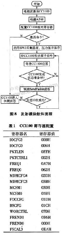 采样发射模块的主程序流程如图8所示。当CC1100检测到唤醒命令时被激活,并唤醒MCU。MCU配置CC1100进入发射模式。MCU采集传感器检测到轮胎内的数据进行处理后,由CC1100发往主机。发送成功后,CC1100和MCU则重新进入休眠状态。寄存器配置如表1所示。