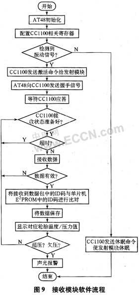 接通电源后,AT48先进行初始化,再对CC1100进行配置。当MCU检测到振动信号时,给采样发射模块发送激活命令。发送命令成功后,立刻进入接收模式,若CC1100接收状态准备好,则可以接收数据。若接收到的数据是有效的,则将接收到的ID与存储在单片机E2PROM中的ID码进行比较,如果与其中的某个ID相匹配则数据就被处理并保存。当检测到温度、压力值偏离正常值则进行报警,提醒驾驶员注意。驾驶员也可通过显示器察看当前检测到的轮胎内部的温度和压力值。