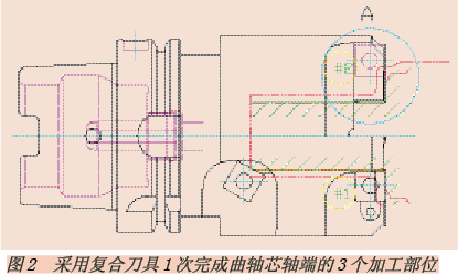 复合加工刀具一般是将几个加工内容组合在一把刀具上,从而只通过一次进给,便可完成全部的加工内容。这样就在很大程度上减少了加工时间,降低了生产节拍,提升了生产力。如在发动机曲轴芯轴端的加工中(图1),传统的工艺安排是车床粗车、半精车、倒角等,这一套工序完成需要耗时40s左右。而通过在CNC加工中心上采用了复合加工刀具后(图2),加工效率得到了极大地提高,加工时间减少了约70%,仅需12s。同时,不仅可以节省了一台车床,而且在不增加机床的情况下,将产量提高了3倍。