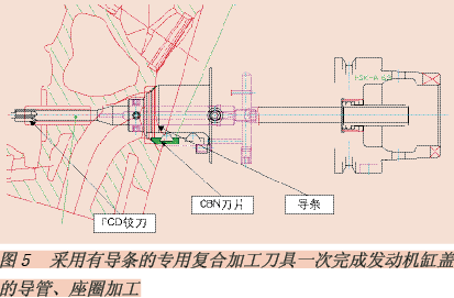 例如为适应高速加工的要求,复合加工刀具都必须经过严格的动平衡处理和验证。为了保证满足高精度、高精度保持性的要求,复合加工刀具对刀柄的选择、刀具本身的制造精度、刀具材料的选择等都有特殊的规范。如发动机缸盖的导管、座圈加工工序是汽车行业中难加工的典型。其特点是尺寸公差小,圆度、同心度要求高,加工表面的形状精度要求高。通过采用有导条的专用复合加工刀具(图5)加工,很好地满足了加工要求。该复合加工刀具具有如下特点: