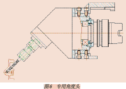 降低成本是企业一直追求的目标。在发动机生产中,低成本的要求从最初的生产线立项开始就贯穿于发动机的整个项目过程中,始终如一。而复合加工刀具的采用以及合理使用,可以有效减少设备投资,赢得最大的经济效益。例如零部件上有斜孔需要加工时,常规方法是在CNC加工中心上增加一个轴,使零件被加工面旋转到与主轴垂直的位置,以便加工,但成本约4万美元。相比之下,如采用复合刀具的方案:专用角度头(图6)+标准刀具+标准CNC加工中心,也完全能达到同样的工艺要求,而专用角度头的成本约3000美元。可见,成本下降是非常巨大的。