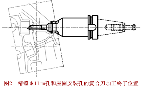 2、采用复合刀具一次完成座圈安装孔和φ11mm导管底孔的精加工。